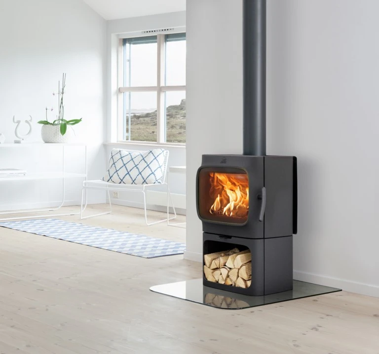 The F 305 B. The horizontal design makes it easy to place logs and provides a rapid heat transfer to the room. Integrated convection reduces the distance to combustible materials at the rear. With Norwegian designers Anderssen & Voll, we have made a stove which merges 160 years of heating experience with timeless design. The higher view of the fire means it can be seen from every angle in the room. The Jøtul F 305 B sits on a solid base and offers the possibility to store wood below the wood firebox. The large door, which covers the ash solution, offers a great view to the fire. A set of cast iron convection sides can be added to reduce the distance to combustible walls.